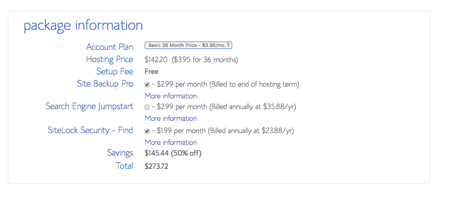 - Other than the above, you do not need the other items that Bluehost sells, so I would uncheck any of the extras that are listed.