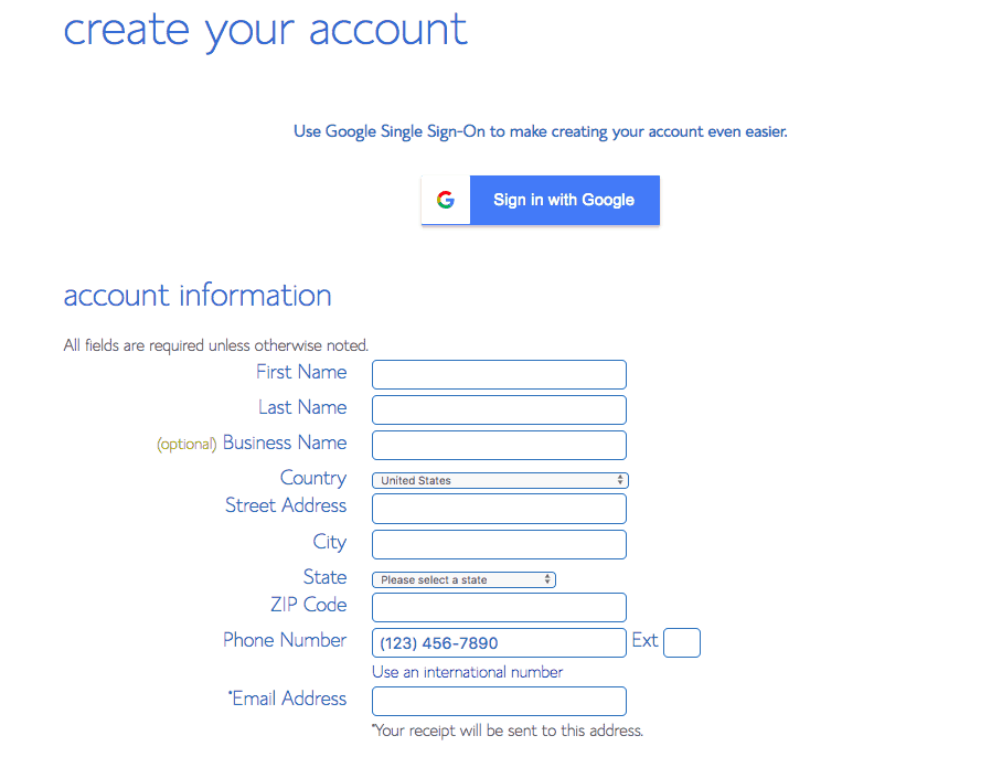 Next, create your account with Bluehost. I love that they have a Single Sign-On Google link so you can register with your google email…or you can create your own account information.